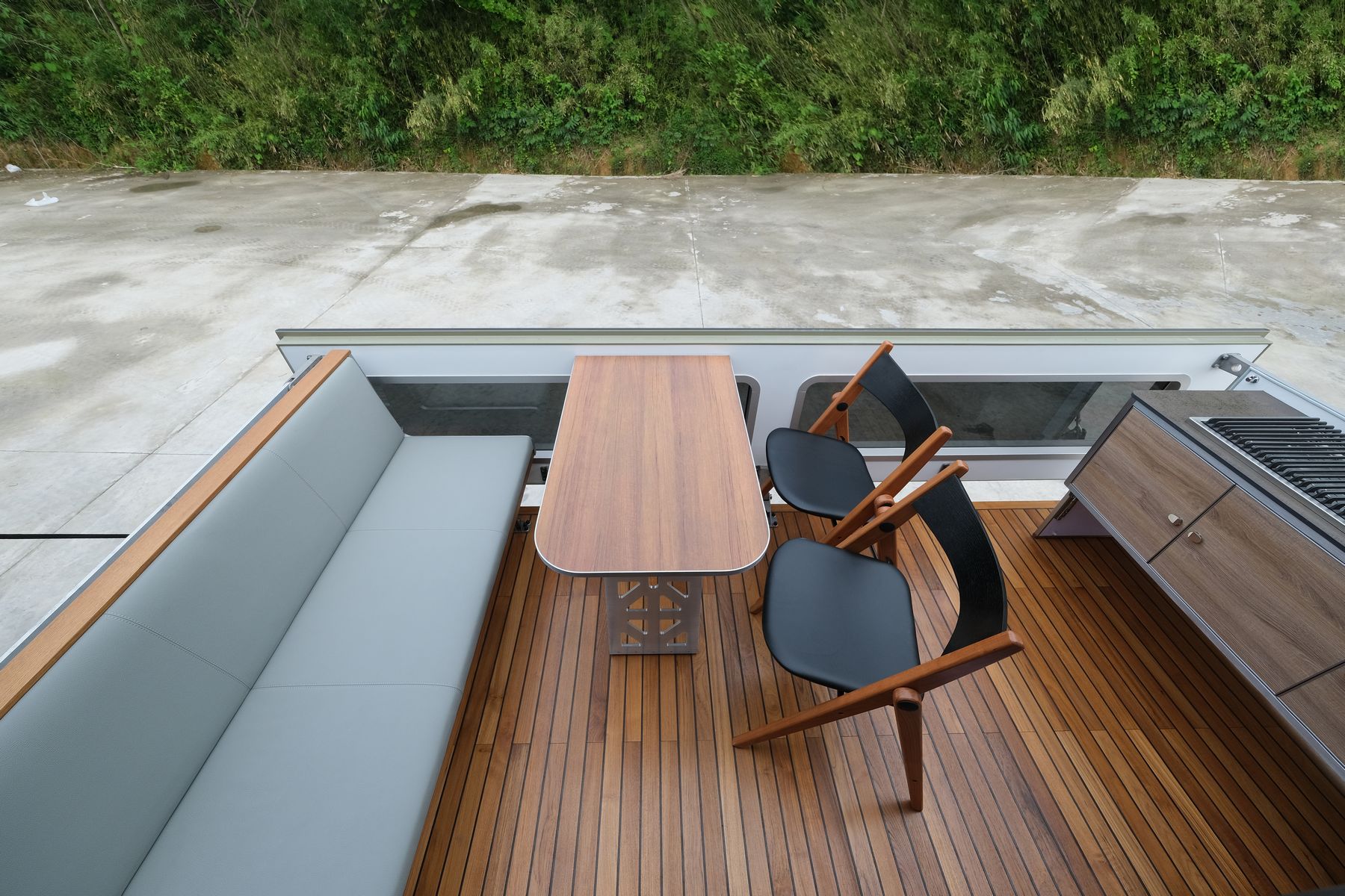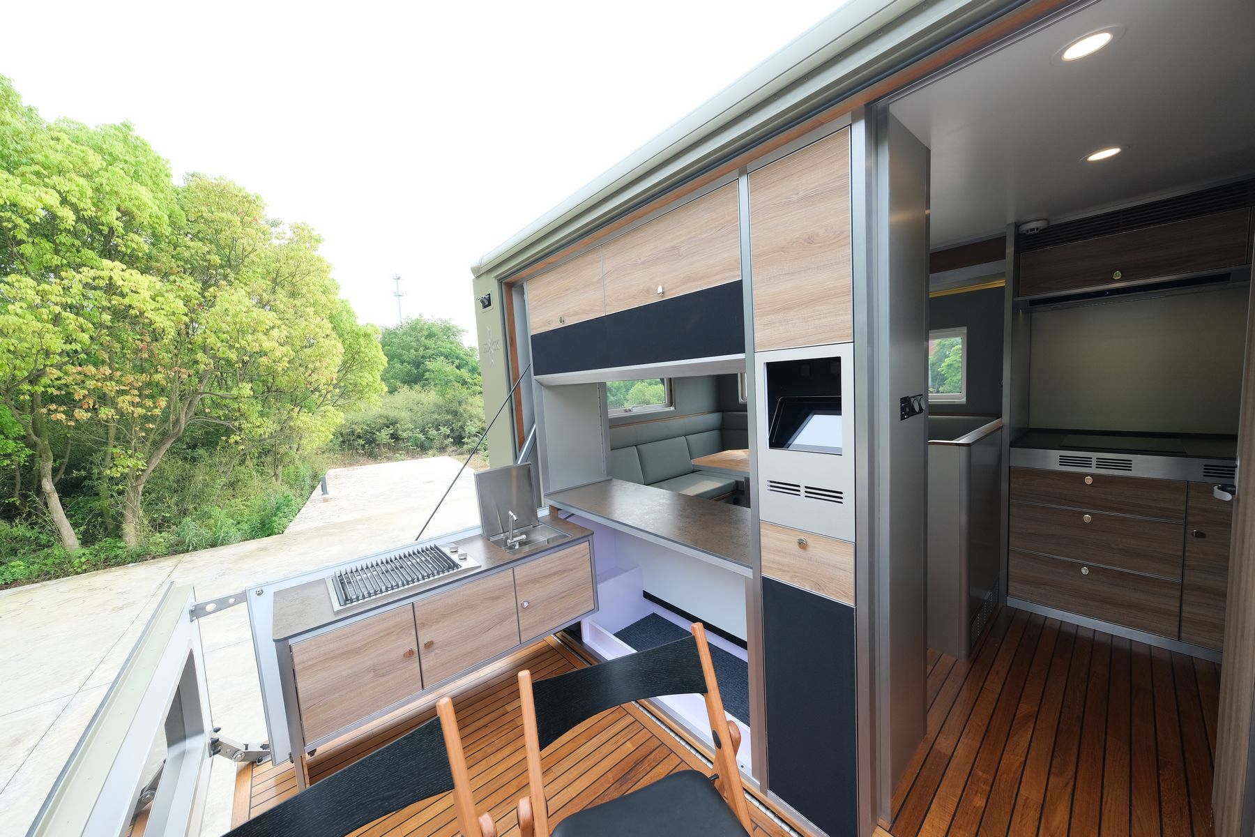 الجانب الخلفي الأيمن : توسيع شرفة ، مع مطبخ في الهواء الطلق ، أريكة ، والمقهى ، خشب الساج الأرضيات